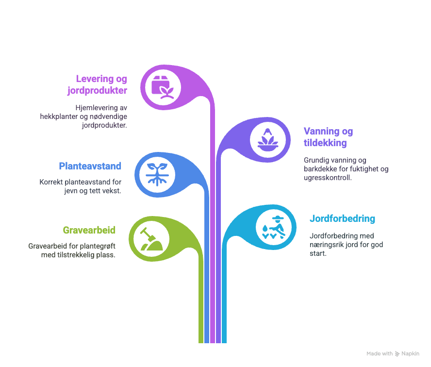 Når du velger å få hekken plantet av profesjonelle, må du regne med en ekstra kostnad utover selve plantene. Denne kostnaden inkluderer selve gravearbeidet, hvor det lages en plantegrøft som er dyp og bred nok til at røttene får godt med plass.
